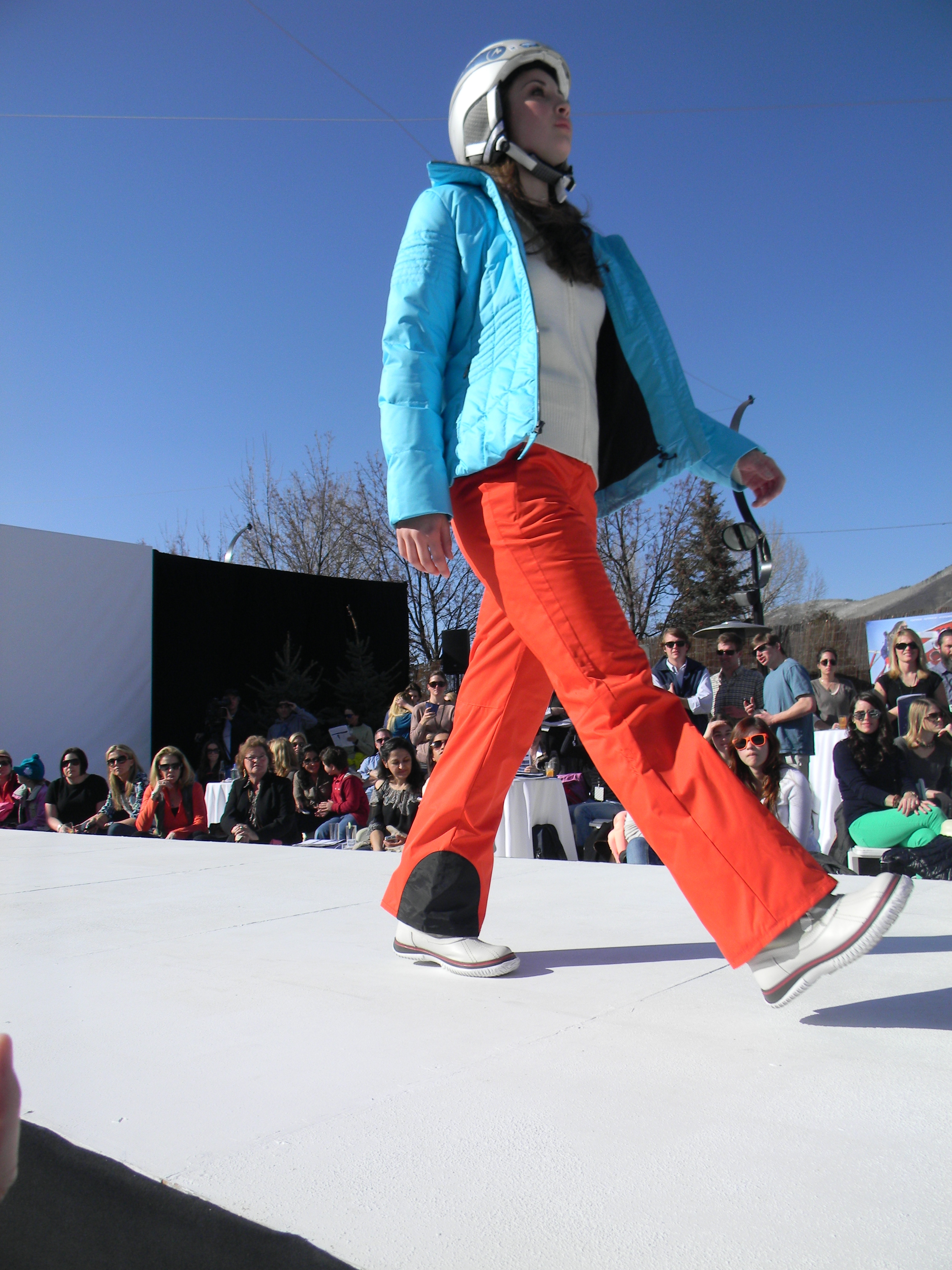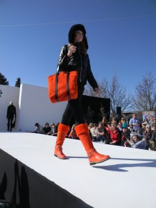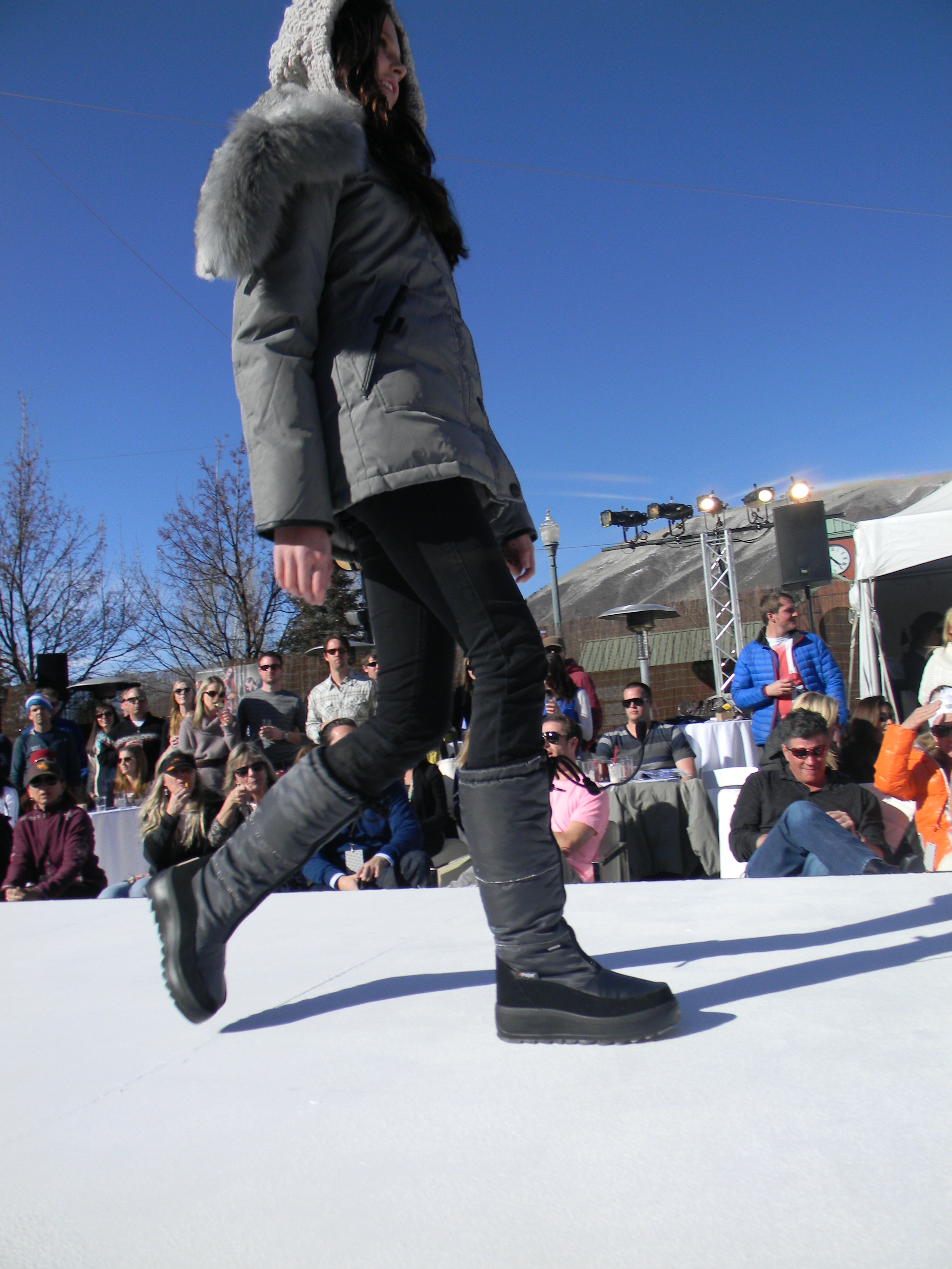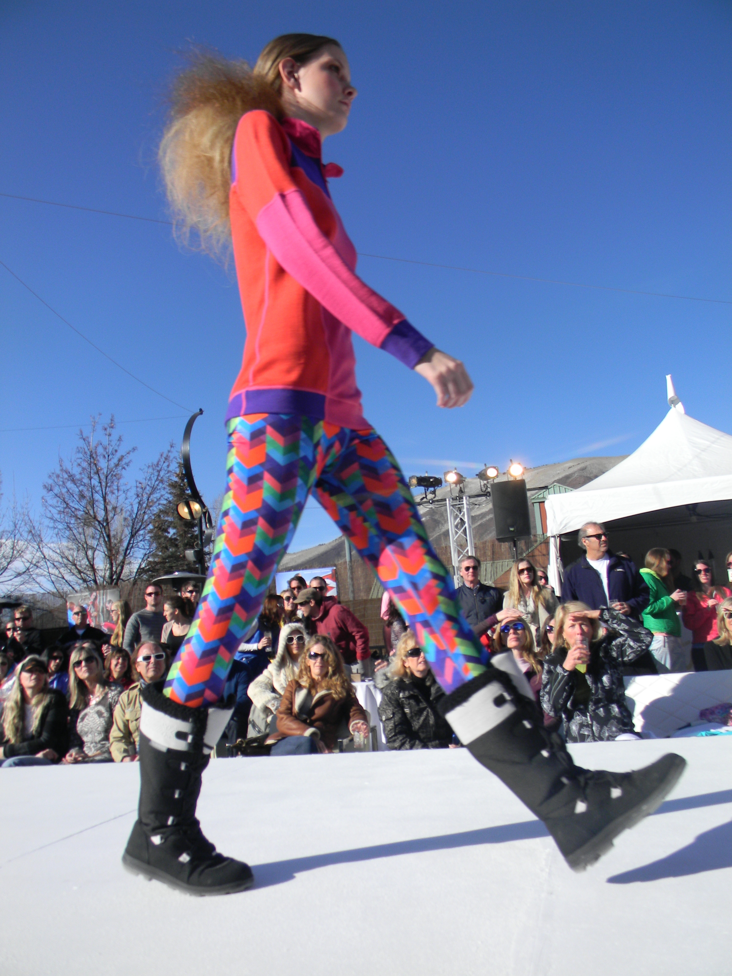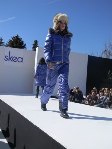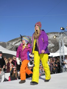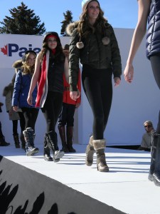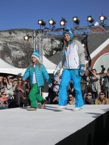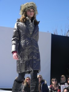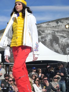 Aspen Fashion Week is on…full blast! Not only are the new ski fashions for 2012-13 free-riding down the runway, but the non-stop visceral beat provided by DJ Pesce fills the entire downtown Aspen area with a driving sound, keeping the mood upbeat and moving. Yours truly can’t help but get up from her runway-side seat in between shows and dance to one of her fave tunes…yesterday was Motown, r&b, classic rock day…you know I loved it! Oh, and the fashions were smoking too…In the first two days, we’ve seen Marmot, Neve, Pajar, Roots, and Skea among others on the snowstage at the ice rink downtown, with evening events at the St. Regis, tented venue, with flowing fashions by David Peck for his line CrOp….some photos now….more to follow. I have to get to the snowstage for today’s shows from Authier and the finale by KJUS. Enjoy…I certainly am!