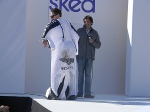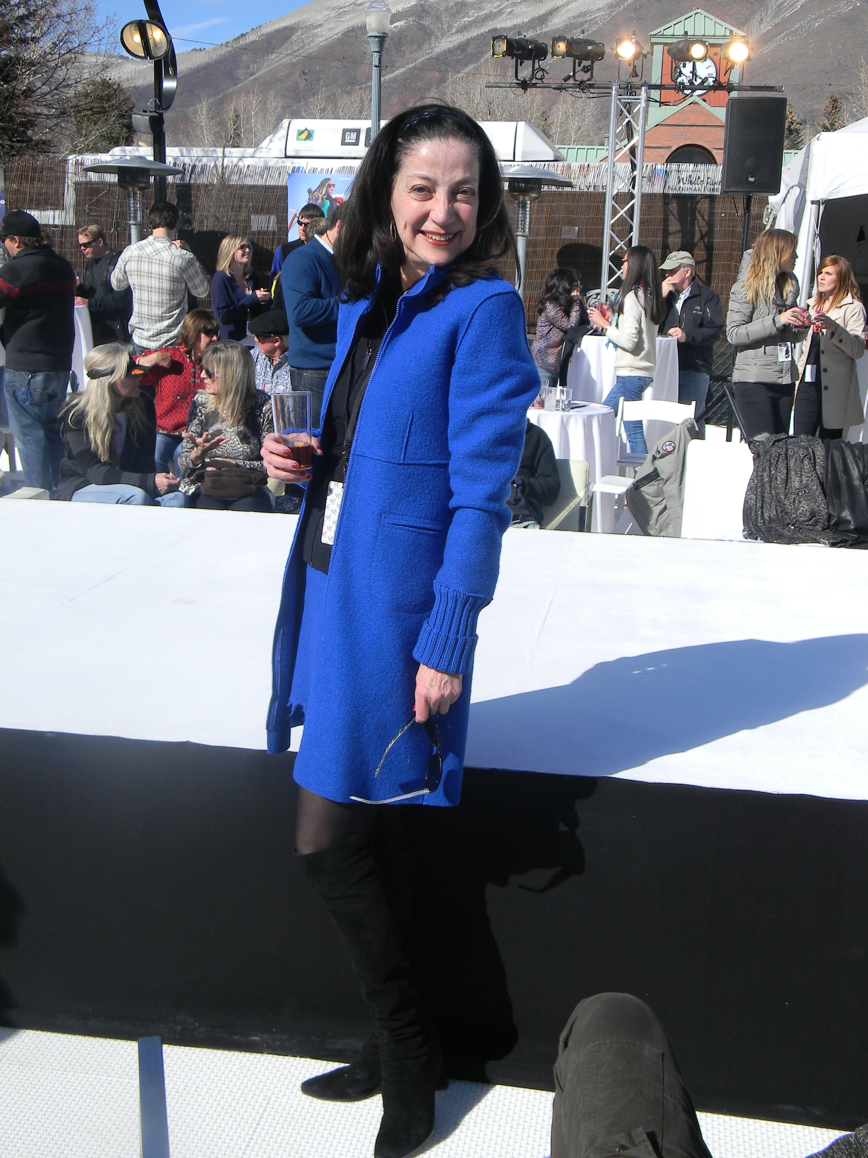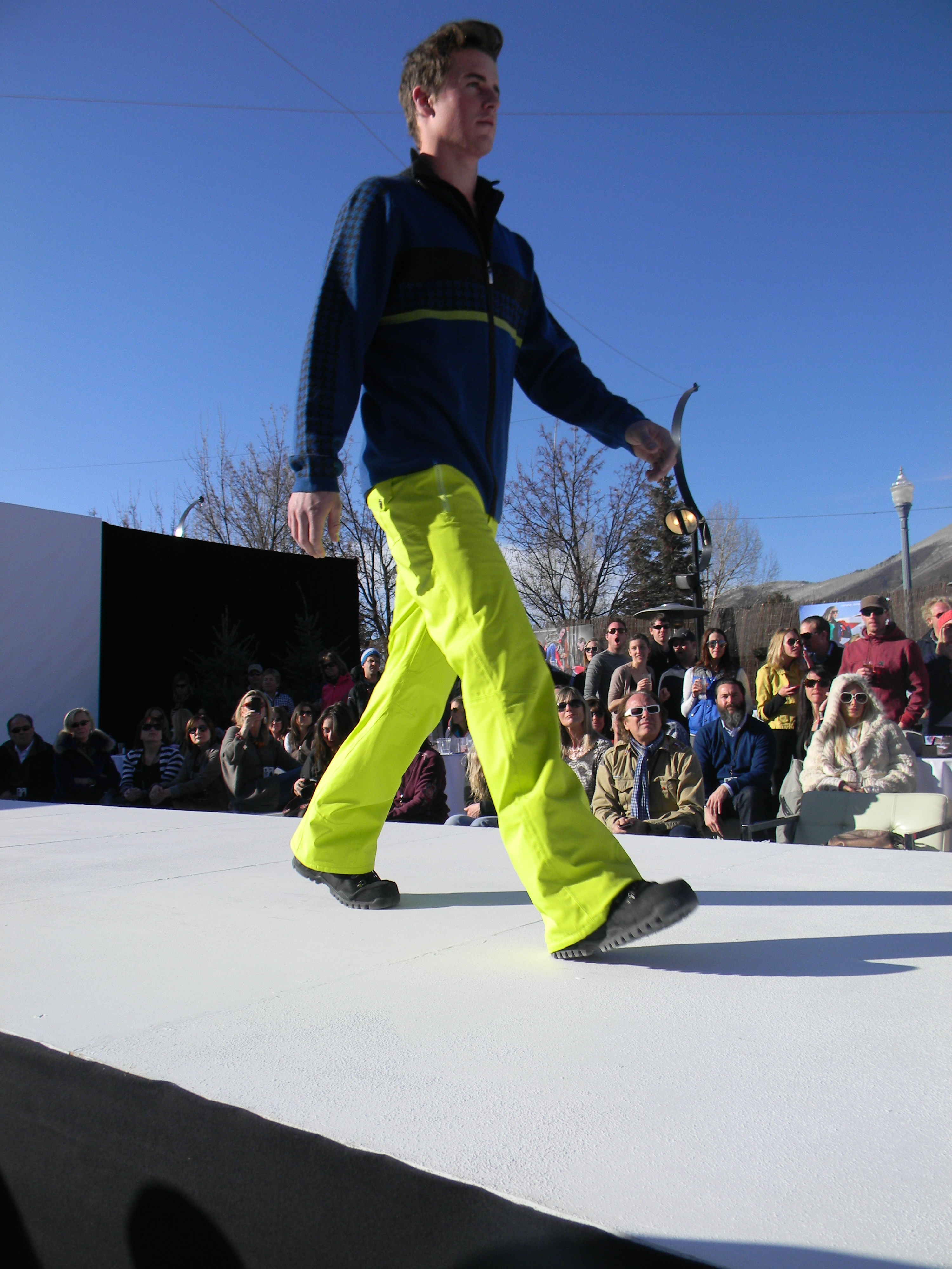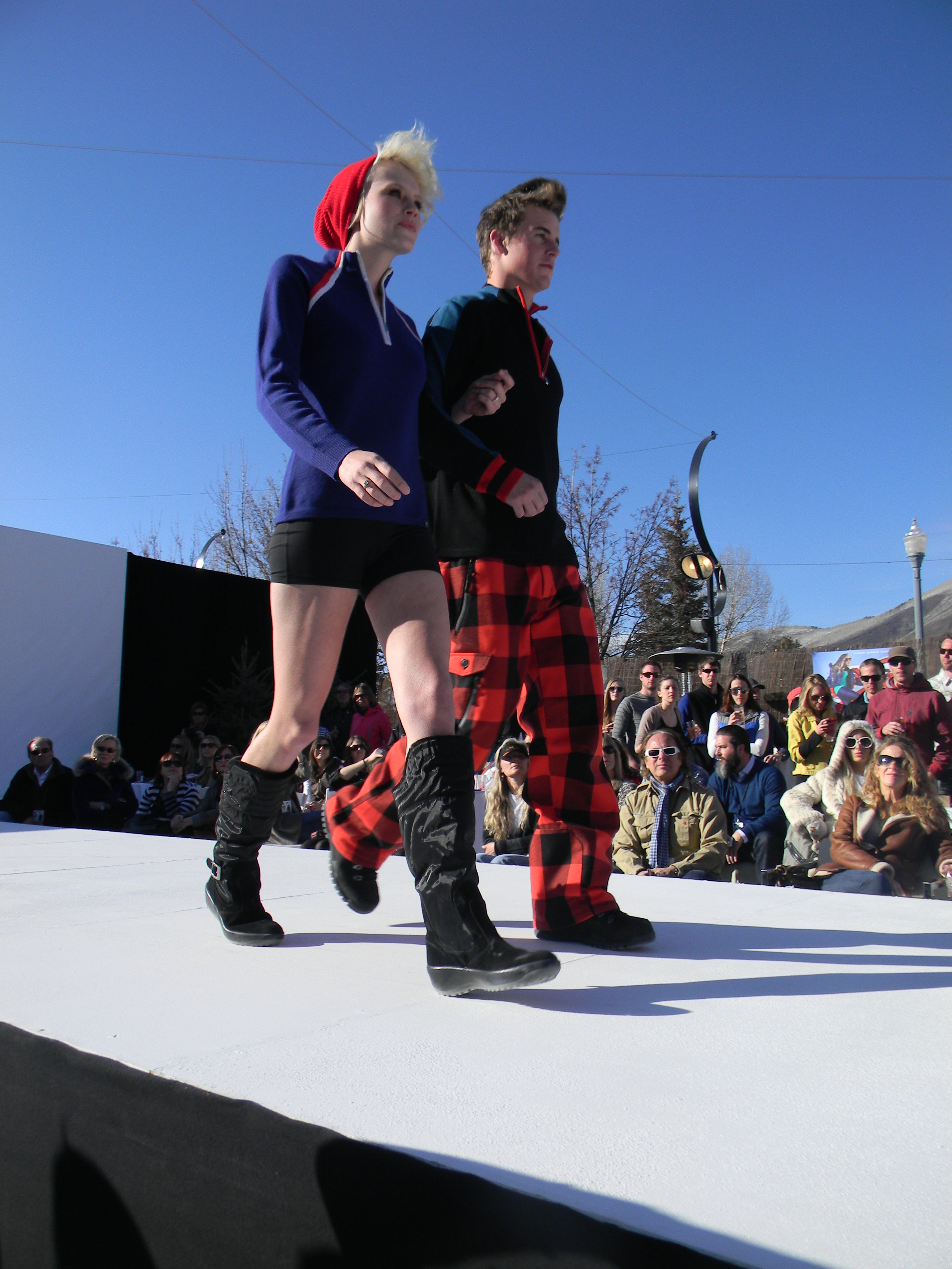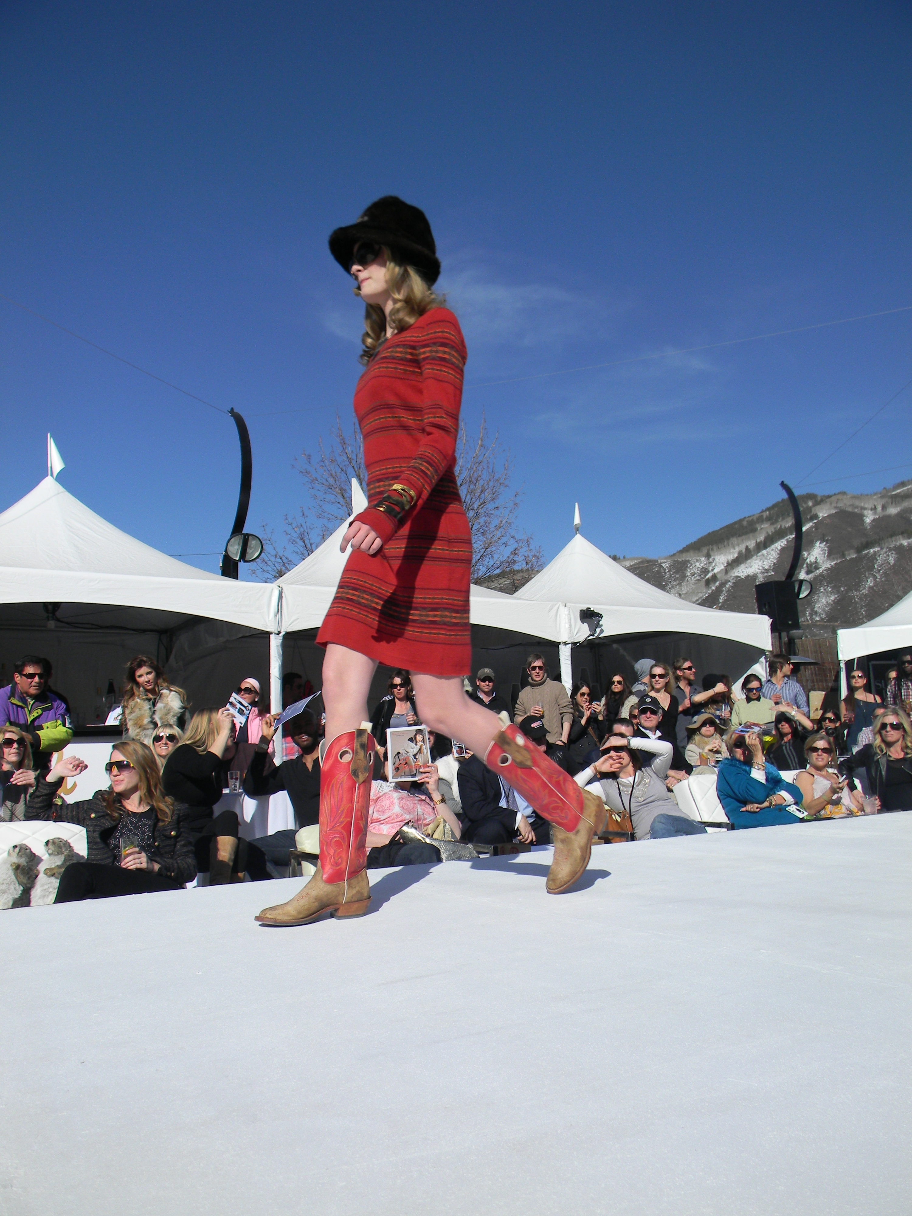 Aspen Fashion Week is on…full blast! Not only are the new ski fashions for 2012-13 free-riding down the runway, but the non-stop visceral beat provided by DJ Pesce fills the entire downtown Aspen area with a driving sound, keeping the mood upbeat and moving. Yours truly can’t help but get up from her runway-side seat in between shows and dance to one of her fave tunes…yesterday was Motown, r&b, classic rock day…you know I loved it! Oh, and the fashions were smoking too…In the first two days, we’ve seen Marmot, Neve, Pajar, Roots, and Skea among others on the snowstage at the ice rink downtown, with evening events at the St. Regis, tented venue, with flowing fashions by David Peck for his line CrOp….some photos now….more to follow. I have to get to the snowstage for today’s shows from Authier and the finale by KJUS. Enjoy…I certainly am!