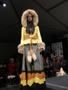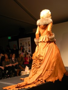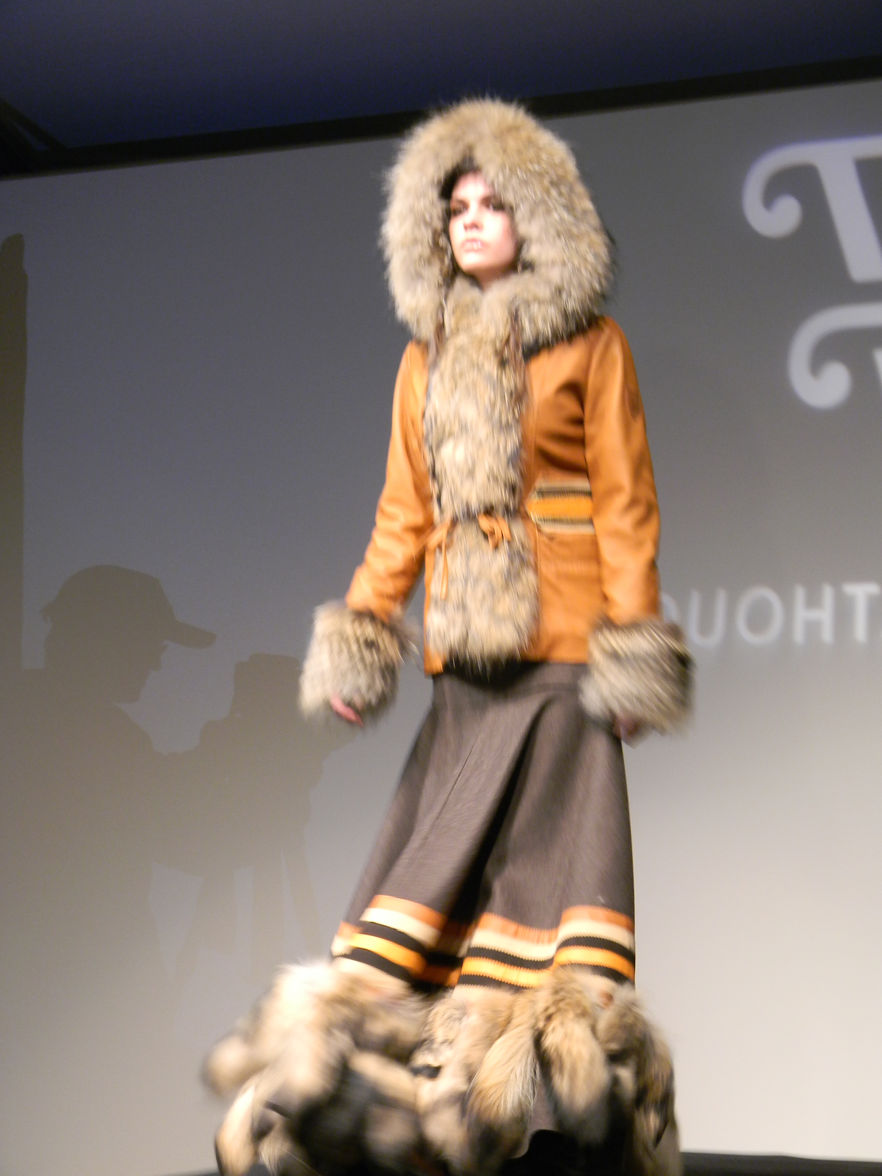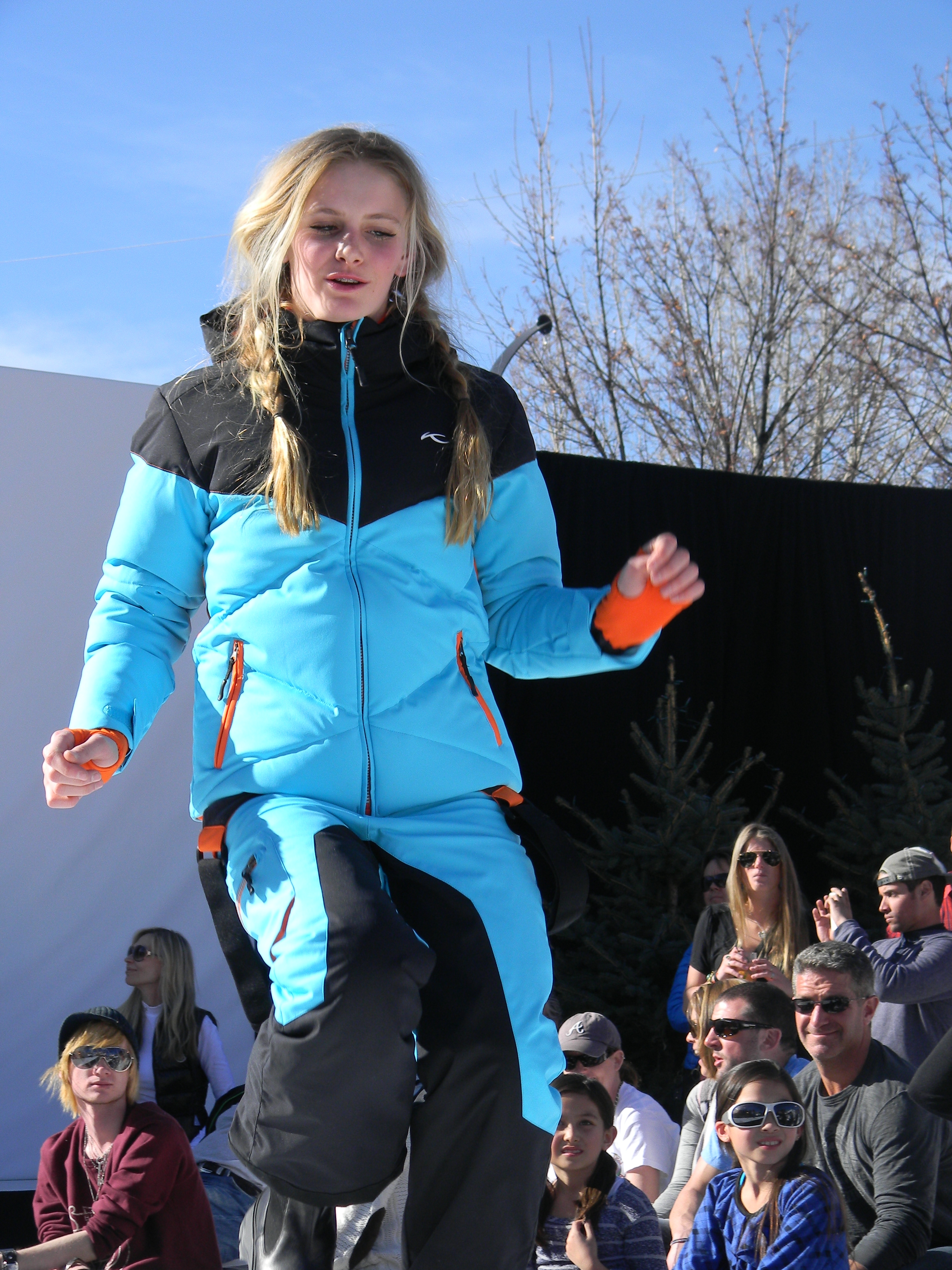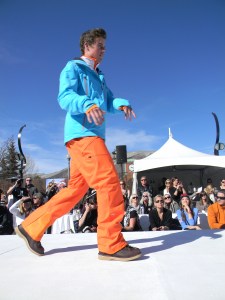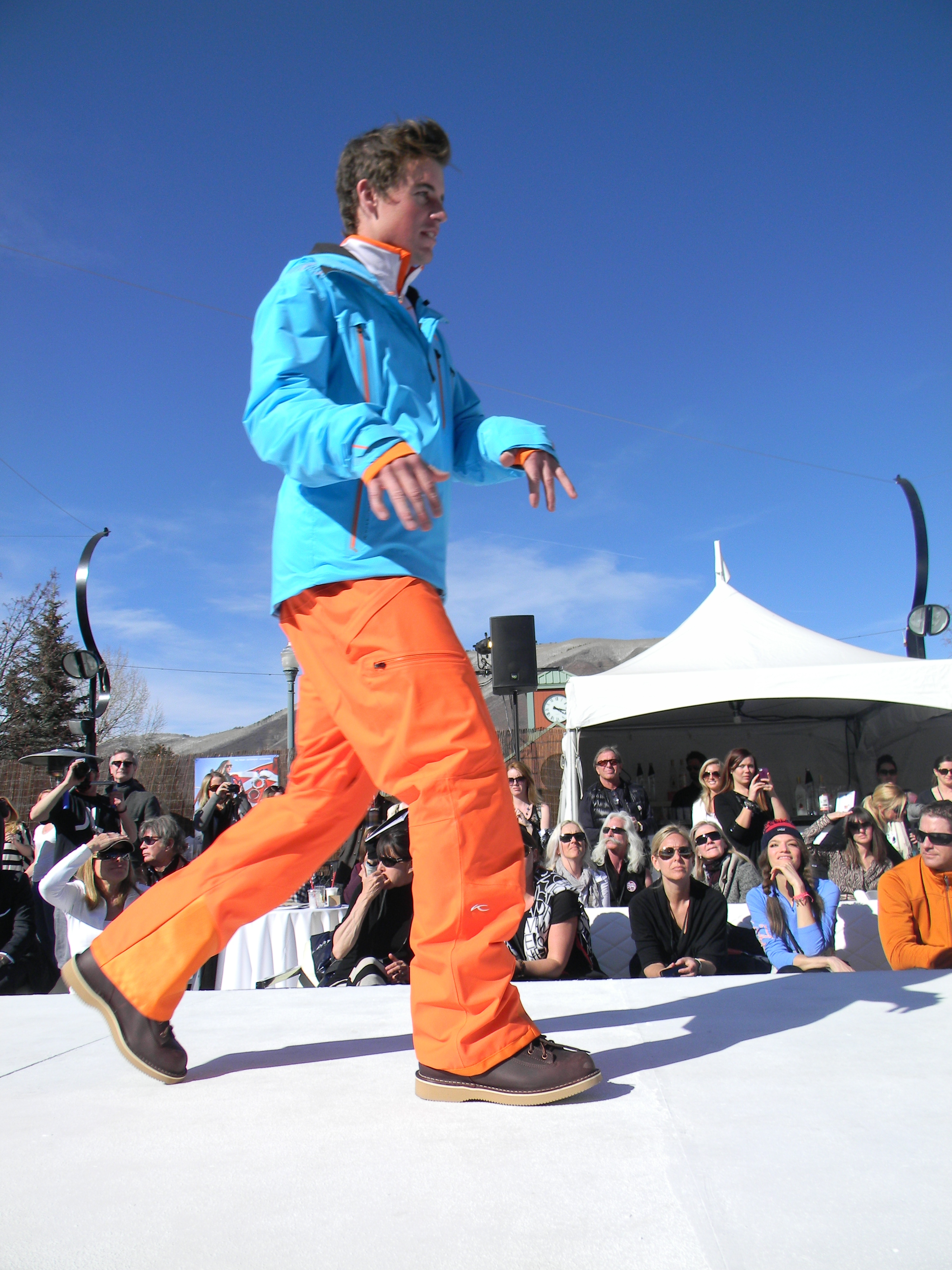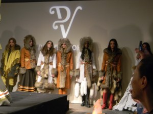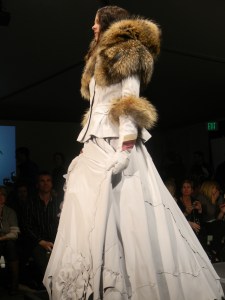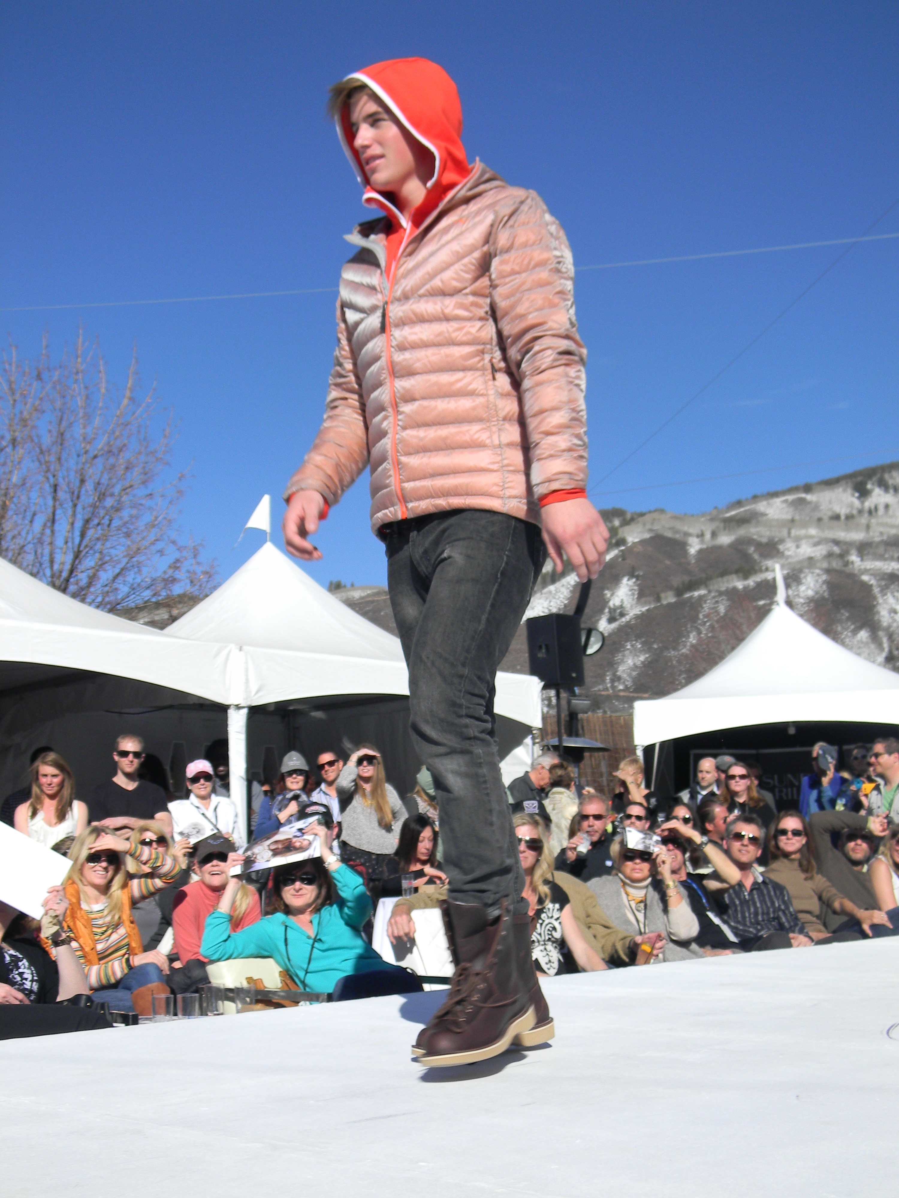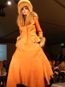 Yesterday was the wrap up of the shows and in-store events. Authier got a good review for its energy. Unfortunately, I missed it due to the fact that the show went on much earlier than planned! It’s kind of ironic, since all of them start at least 20-30 minutes late, which is more the the norm. So a lot of us simply missed it…oh well, more room for photos from the kinetic KJUS show, with its fun mixing of colors, and innovative fabrics. This year they produced a thin translucent cover layer for the dyed down that lay underneath…it’s even water resistant! No more drowning in your down jacket during a snowstorm! The showstopping finale show was Finnish designer Wille Rajola’s collection, called DUOHTAVUOHTA…don’t ask me how to pronounce it…. of the most fantasy-like creations using leather and fur,,,Finnish raccoon naturally…..jackets, coats and full length skirts, augmented by gala-ready crinolines. His line reminds me of a princess from the remote northern regions of Scandanavia…coming out of her isolated castle to meet her prince…and doesn’t a girl always harbor some form of that dream in her heart?….Rajala’s line feeds into that fantasy with great opulence and glamour. His are the perfect gowns to be married on stylish and majestic Aspen Mountain. I heard that very comment from a few of the enraptured women at the end of the show….ah, yes.