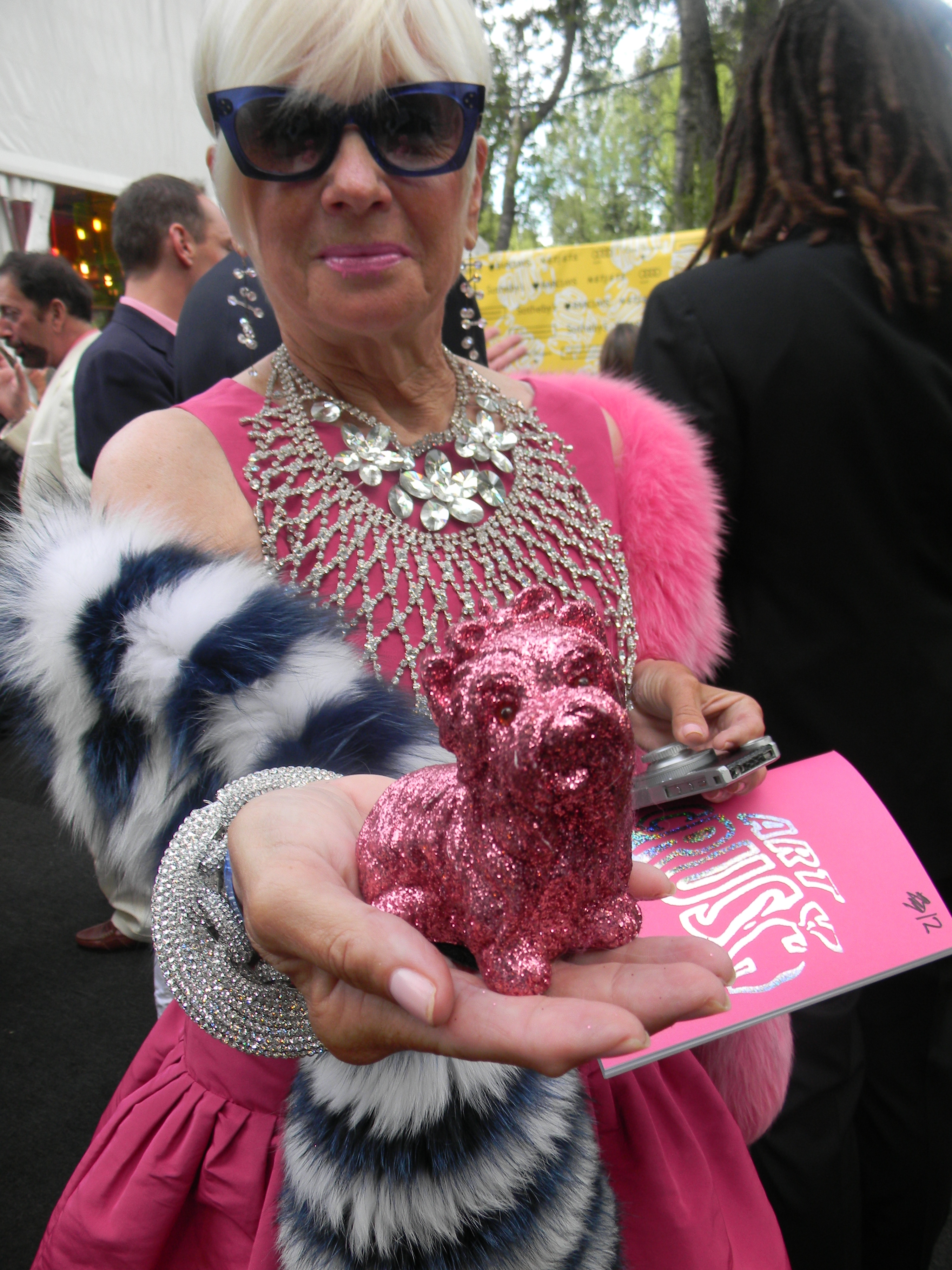 Shari Applebaum in Valentino and ‘adapted’ pet pink puppy purse by artist Jeff Koons.